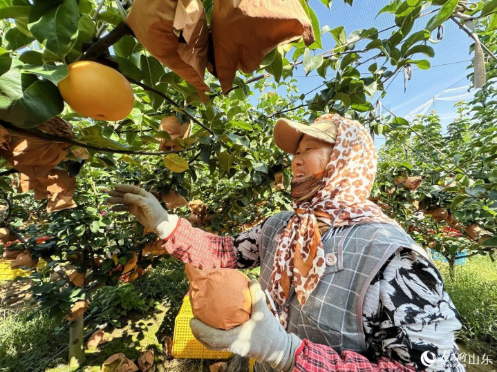 果农左彦玲利落地扎紧头巾、戴好手套,拎起果箱,与乡亲们一起,三两步迈入梨园深处。