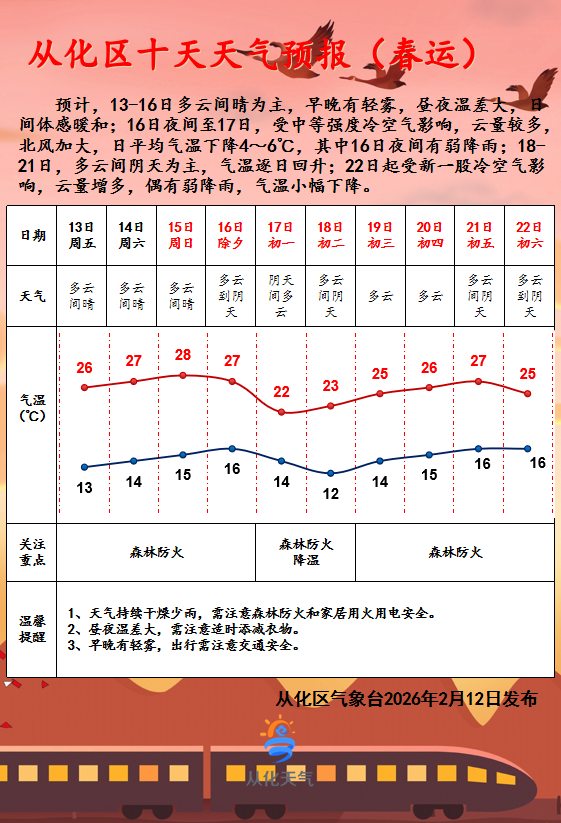 2 月 16 日(除夕):多云转阴天,早晚有轻雾,气温 16~27℃,守岁前天气还算平稳